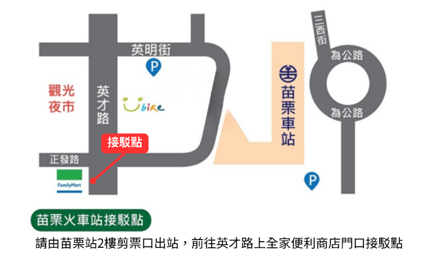請由 二樓剪票口(西站出入口) 出站後,朝 英才路 方向步行,接駁點位於英才路上全家便利商店門口,詳見下圖。
